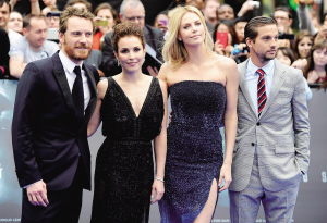 5月31日,在英国伦敦,(左起)德国演员麦克·法斯宾达、瑞典演员劳米·拉佩斯、南非演员查理兹·塞隆、美国演员洛根·马歇尔-格林参加电影《普罗米修斯》的全球首映式。《普罗米修斯》是一部由20世纪福克斯公司制作、雷德利·斯科特导演的3D科幻电影。 新华社发