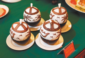 椰壳是别具风味的容器,椰肉和椰水具有“调和百馔”的特性,这也造就了种类繁多的椰子盅菜品,寻常的有鸡盅、羊盅、鸽盅,高档的有鱼翅盅、燕窝盅、参肚羹盅等等。林俊春解释,因为文昌鸡在海南食材中的特殊地位,所以被选为“十大菜肴”的海南椰子盅特别注明是鸡盅。