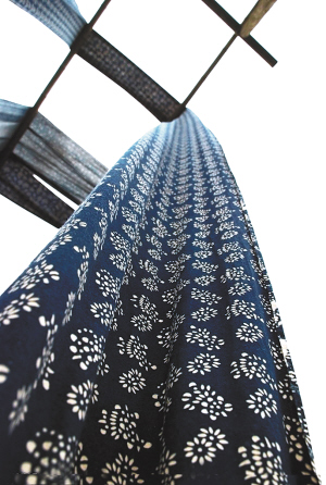 穿过晾晒染布的庭院,就是染布作坊。乌镇人就在作坊里现染了蓝印花布,挂起晾干,立时可取。他们突破了传统的印花范围,将一些可爱的卡通人物,也印染在白布上,吸引着游客购买。一位老人在那里表演印染工艺,有好奇的游客想学习,他和善地让出位置,在一旁微笑着指点游客操作。