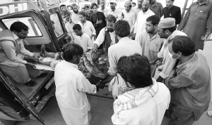6月4日,人们将伤者送往巴基斯坦东部城市杰格瓦尔一家医院进行抢救。 巴基斯坦警方4日说,一辆客车当天凌晨在巴北部城市伊胡达坠入山涧,造成至少30人丧生,另有60余人受伤。 新华社发