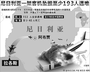 据新华社拉各斯6月4日电 (记者李怀林 陈淑品)尼日利亚丹纳航空公司一架客机3日下午在拉各斯机场附近坠毁,并撞上一座两层建筑物,造成190余人死亡。据多方核实,这架客机上至少有6名中国乘客。