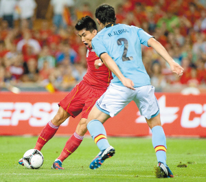 中国队在上半时的表现可圈可点。开场不久郑智一度曾获得绝佳进球良机,他单刀突入,成功晃过卡西利亚斯,但面对空门表现犹豫,在及时回防的西班牙后卫干扰下将球打在了边网上。第30分钟,郑智再次制造威胁,接于海的传球倒地铲射,但卡西利亚斯奋力将球挡出。前45分钟,中国队还曾几次获得反击良机,而反观世界排名第一的西班牙队,却表现不佳,防守频现漏洞,进攻组织不力,让人大跌眼镜。