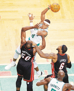6月4日,凯尔特人队球员隆多(上)在与热火队的比赛中上篮。 新华社发