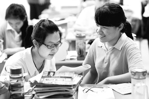 | 湖南师范大学附中海口中学高三年级教室,两名毕业生在交流。