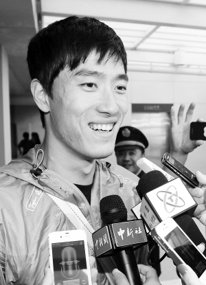 | 6月5日,刘翔在上海浦东国际机场接受媒体采访。 新华社发 |