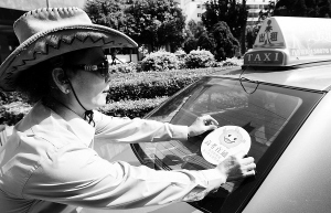 6月5日下午,来自海口的姐许女士在给其驾驶的车牌号为“琼466666”出租车窗上粘贴“爱心车标”。许女士从去年就开始参与爱心送考生活动。 高考在即,由《南国都市报》发起的“2012爱心送考”活动得到许多爱心车主和爱心企业的积极参与,有近千名考生顺利与爱心送考车结对。 本报记者 宋国强 摄