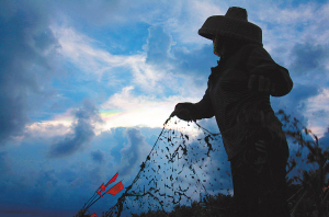 6月5日傍晚,在万宁市神州半岛西部天空出现绚丽的“七彩云”,当地渔民边收网边观赏这色彩不断变化着的天象奇观。之后随着太阳下山,“七彩云”慢慢消散。