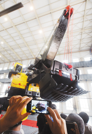 6月5日,一名参观者在为WK-75型矿用挖掘机拍照。    当日,世界上首台规格最大、技术性能最先进、生产能力最高的WK-75型矿用挖掘机,在山西太重集团公司正式下线。这台从设计到制造完全国产化的挖掘机,采用了世界先进的智能化控制技术、运行状态自动检测和故障诊断、能量回馈等技术,可满足国内外现代化大型露天矿山高效、低耗、智能化和绿色开采的需要。   据介绍,WK-75型矿用挖掘机总长37.5米,宽17.3米,从履带到顶部高达23.5米,总重量近2000吨,其一个月的煤炭开采量可达到500万吨,相当于一座大型煤矿一年的产量。WK-75型矿用挖掘机的成功下线,标志着我国在重大装备领域实现了从“跟随”到“引领”质的飞跃。              新华社发
