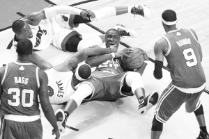 凯尔特人队皮特鲁斯(中)与热火队詹姆斯(左中)、韦德(左上)拼抢。 新华社发