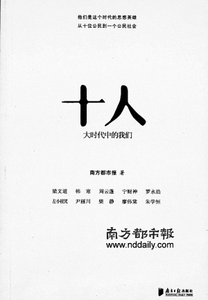 这本由南方都市报编著的《十人———大时代中的我们》是《南方都市报》对梁文道、韩寒、周云蓬、宁财神、罗永浩、左小祖咒、尹丽川、柴静、廖伟棠、朱学恒十人的专访的汇集,他们或是时评家、或为音乐人、导演、或为作家、公众意见领袖,一言蔽之,这十人是受到中国“80后”喜爱的文艺、思想、艺术的人物,他们的一些思想、言行、举止影响了21世纪最初十年的中国,也或多或少加速了这个时代进步的进程。本书的出版是一种新世纪10年来文化思想史的回顾,我们可以从他们身上寻找这个时代的对青年人影响的走向。