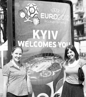 | 随着2012欧洲杯的临近,乌克兰首都基辅街头的足球气氛也日渐浓郁。图为6月7日,两位女孩在欧洲杯的宣传画前留影。 新华社发 |
