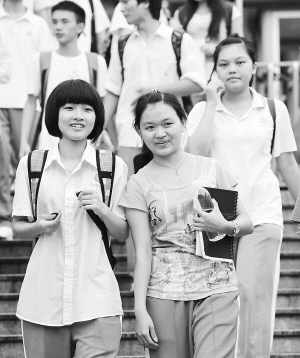 七日下午考生们有说有笑地从海口侨中考点走出来。 本报记者 古月 摄