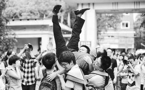 6月8日,在湖南长沙市一中考点,高考结束后学生们抛起老师欢呼。 当日,全国部分地区2012年高考结束。2012年全国高考共有约915万名考生报名参加考试。 新华社发