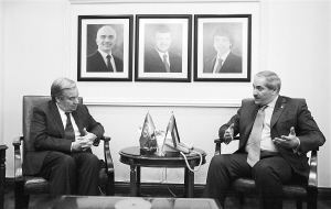 6月7日,约旦外交大臣朱达(右)在安曼会见联合国难民事务高级专员安东尼奥·古特雷斯。 约旦外交大臣朱达7日在安曼会见联合国难民事务高级专员古特雷斯时呼吁国际社会加强合作,为叙利亚难民提供人道主义援助。 新华社发