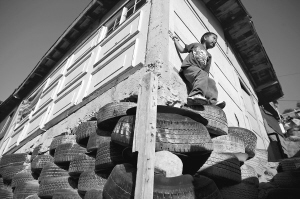 5月16日,在墨西哥西北部的下加利福尼亚州蒂华纳市,5岁的埃米利奥在由废弃轮胎堆砌而成的房屋旁玩耍。 将废弃轮胎使用于建筑之中是蒂华纳市一个常见的情景,主要集中在贫民区及郊区。因废旧轮胎在当地很容易获得,人们便将其用于建筑之中。 新华社发