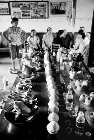 | 6月7日,海口市新海村天妃宫,摆满了供奉妈祖的祭品。 |