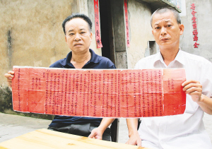 | 海顺兴、海顺成兄弟展示先祖留下的出租铺面的契约。 本报记者 陈耿 摄 |