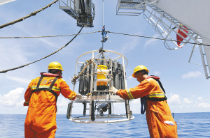 6月11日,科考队员们将刚出水的调查设备组合拖进船中。 新华社发