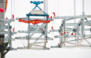 张家界澧水特大桥地处张家界市永定区和湘西自治州永顺县交界处,是张花高速公路关键控制性工程之一。大桥横跨澧水河大峡谷,谷底宽约50米,谷顶宽约420米,谷底与桥面高差达400米。通车后从张家界到重庆由现在的8小时缩短到4小时。上图为工作人员在施工。 新华社发