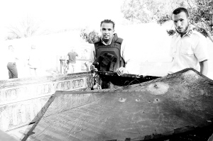 11日,在利比亚第二大城市班加西,安全人员运走被火箭弹击碎的汽车挡风玻璃。 一支载有英国外交官代表团的车队11日在利比亚第二大城市班加西遭遇火箭弹袭击,造成一人受重伤。 新华社发