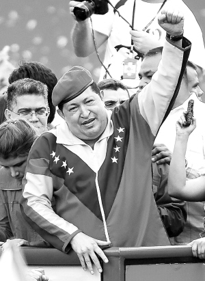 6月11日,委内瑞拉总统查韦斯在首都加拉加斯向支持者致意。 当天,查韦斯前往委内瑞拉选举委员会正式确认了其参加今年10月7日总统选举的候选人资格。查韦斯自1999年2月起一直担任委内瑞拉总统,谋求继续连任的他在恶性肿瘤治疗期间坚持不退选、不交权。 新华社/法新