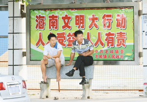 6月6日下午,澄迈县老城镇的一处公交车站候车亭,石椅的座位板不翼而飞,两位等车的男子翘着“二郎腿”坐在椅背上等车。这种不雅的行为与背后“海南文明大行动”的口号形成了强烈的反差。 本报记者 王凯 摄