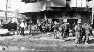 →在巴格达,安全人员查看汽车炸弹袭击现场。 新华社/路透