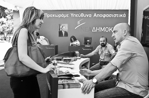6月12日,在希腊首都雅典,一名选民在新民主党的选举工作站内询问相关事宜。 希腊将于6月17日举行一个半月之内的第二次议会选举。这次选举将在很大程度上决定希腊在欧元区的去留,乃至关系到整个欧元区的前途。最新民意测验显示,有望进入议会的仍可能是在5月6日选举中领先的7个政党。 新华社记者 刘咏秋 摄