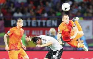 | ← 荷兰队海廷加(右)与德国队厄齐尔(中)拼抢。 新华社发 |