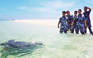 13日清晨,天刚蒙蒙亮,西沙某水警区中建岛守备队指导员许双凯带领巡逻队环岛进行例行性巡逻时,在岛中部的洼地处,上等兵覃茂庆发现了异常情况:一只黑呼呼的“铁锅”倒扣在那里。巡逻队员围过去一看,原来是退潮时,一只大海龟没来得及游走搁浅了。