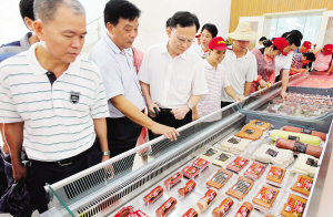 | 2012年6月15日,雨润200万头生猪加工项目顺利建成正式投产,参加投产仪式的养猪大户及乡镇干部在参观雨润生产的猪肉系列产品。