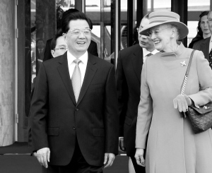 胡锦涛高度赞赏玛格丽特二世及丹麦王室为增进中丹友谊作出重要贡献。胡锦涛表示,中国和丹麦虽然相距遥远,但两国人民有着长期友好交往的历史。新中国成立后,丹麦是最早同新中国建交的西方国家之一。33年前,女王陛下对中国进行正式访问,成为首位访华的北欧国家元首,谱写了中丹交往史上的重要篇章。2008年,中丹建立全面战略伙伴关系,两国关系迈上新台阶。