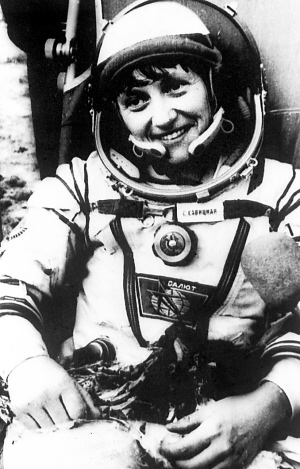 | 1984年7月30日,前苏联宇航员斯韦特兰娜·萨维茨卡娅返回地面,从“联盟T—12”号飞船的宇宙密封舱走出。萨维茨卡娅成为第一个在太空行走的妇女,她也是第一个进行过两次太空旅行的妇女。 |
