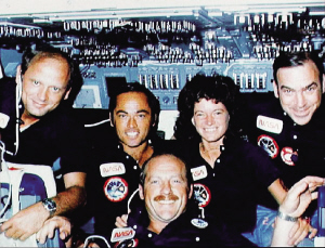 | 1983年6月,美国第一位进入太空的女宇航员莎丽·赖德(右二)在“挑战者”号航天飞机上与男同事们合影。 |
