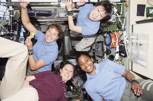 | “发现”号航天飞机2010年4月5日升空,7日与国际空间站对接,“发现”号三名女宇航员与国际空间站一名女宇航员“会师”,创下同时身处太空女性人数最多的纪录。图为4名女宇航员合影。 |