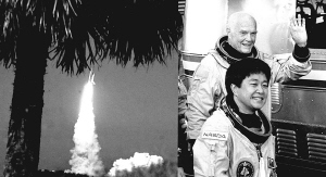 | 1998年10月29日,美国宇航局“发现”号航天飞机从佛罗里达州卡纳维拉尔角的肯尼迪航天中心发射升空。日本第一位女宇航员向井千秋(前)和美国宇航员格伦准备登上航天飞机。 |