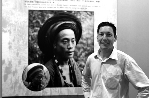 | 布兰登站在影展上他最喜欢的那幅黎族青年北哈的特写前。海南日报记者 宋国强 摄 |