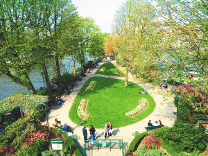 鲜花的草坪上,人们躺着在沐浴春天的阳光。一对对的恋人们,在河的堤岸边相拥穿行;他们眼里只有彼此和春天。