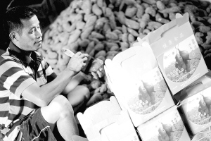 | 澄迈县桥头镇沙土甘薯合作社农民,将注册了商标的沙土甘薯打包,销往省内外。 本报记者 张杰 摄 |