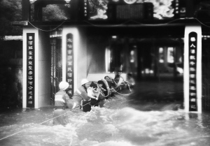 | 6月18日,浙江省温州市突降暴雨,温州消防官兵在天柱山风景区营救被困群众。 新华社发 |