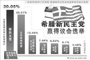 6月17日,希腊新民主党领导人萨马拉斯在雅典向支持者挥手致意。 新华社/法新
