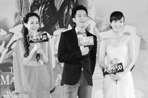 6月18日,由赖水清执导,钟汉良、陈楚河、张檬、张定涵等联袂出演的武侠剧《天涯明月刀》在北京举行首播新闻发布会。《天涯明月刀》根据古龙同名小说改编,讲述一个关于复仇与大爱的故事。该剧将于6月24日首度登陆湖南卫视黄金档。 图为主演张定涵(左)、钟汉良(中)和张檬(右)在《天涯明月刀》首播会上发言。新华社发