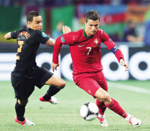 | →18日,葡萄牙队球员克·罗纳尔多(右)在比赛中与荷兰队球员范德维尔拼抢。 新华社发 |