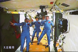 | 6月18日拍摄的北京航天飞控中心大屏幕显示的航天员景海鹏、刘旺、刘洋在天宫一号实验舱内的画面。 新华社记者 查春明 摄 |