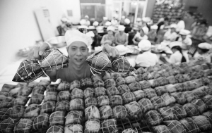 | 6月13日,在定安县城某酒店里,能工巧匠们忙着绑定安黑猪粽子。定安黑猪肉粽名闻岛内外,端午节未到,这里的粽子早已热销。 本报记者 张杰 摄