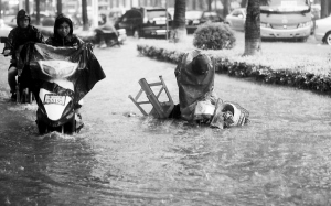“怎么回事?简直是要命啊!”今天下午7时许,一名海口市民冒着暴雨,在积水严重的海口市琼山区红城湖路上骑着电单车“乘风破浪”赶路,随着他“啊”的一声,车子卡到积水中的暗坑里,车子坏了,人也差点受伤,被吓坏了的他,抱怨起来。