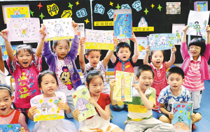 当日,江苏苏州市彩香幼儿园开展“我心目中的‘神九’飞天”主题绘画比赛和“‘神九’相约外太空”图展活动,百余名小朋友各显身手比画艺,表达对“神九”飞天的祝福。