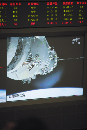 | 6月18日拍摄的北京航天飞控中心大屏幕显示的神九飞船与天宫一号交会对接的画面。 新华社记者 王永卓 摄 |