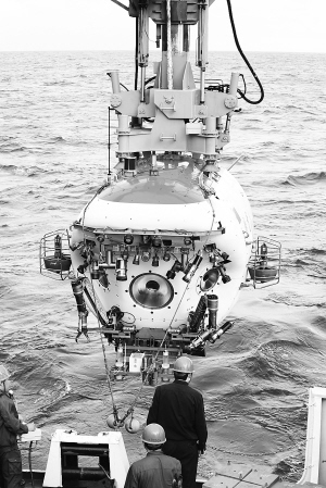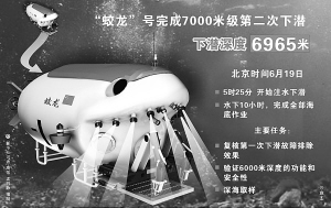 据新华社“向阳红09”船6月19日电 (记者罗沙)中国“蛟龙”号载人潜水器19日进行七千米级海试第二次下潜试验,潜水器开展了近底巡航、照相、摄像、海底微地形地貌测量,并坐底完成沉积物及海水取样、标志物布放等作业,最大下潜深度达到6965米。