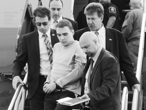 29岁的马尼奥塔当天在加拿大蒙特利尔警方押送下,乘坐加拿大皇家空军的一架军用运输机离开德国柏林,抵达蒙特利尔附近的米拉贝勒机场。